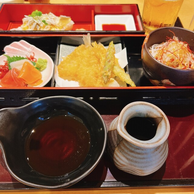 紫陽花セットは、天ぷら、お刺身、キスの酢飯、ラー...