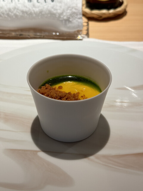 こちらの先付けは旬のフルーツをうまくお料理に還元していて、コースの最初に相応しいわくわくするお料理...
