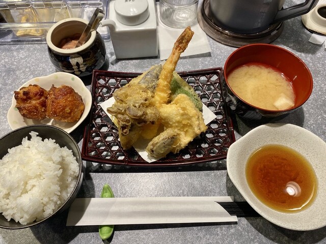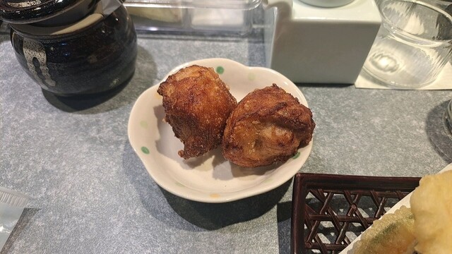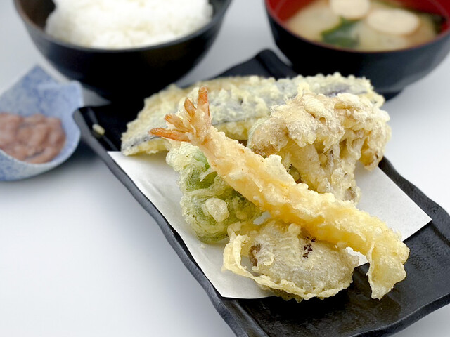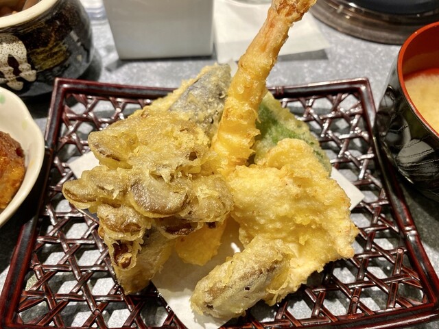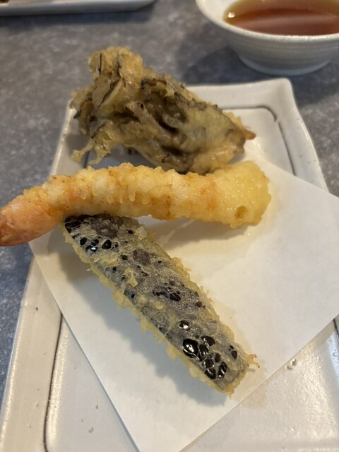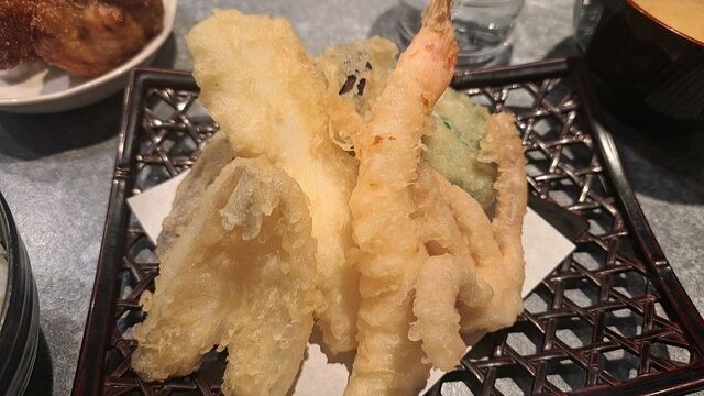 ・野菜天3種(かぼちゃ、ナス、ピーマン)、大海老天、鶏天2枚、椎茸、舞茸。