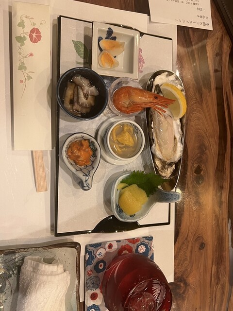 前菜は、大ぶりの生牡蠣、なまこ、数の子の磯部巻き、海老、塩水ウニ、ホヤなどのお膳。そしてお待ちかねのカニ登場。活きたタラバガニを持たせてもらいシャッターチャンス。