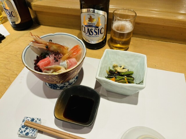 イクラが乗った小鉢やマグロとタコの刺し身と一緒に北海道と言えばのクラシックビールで喉を潤しま...