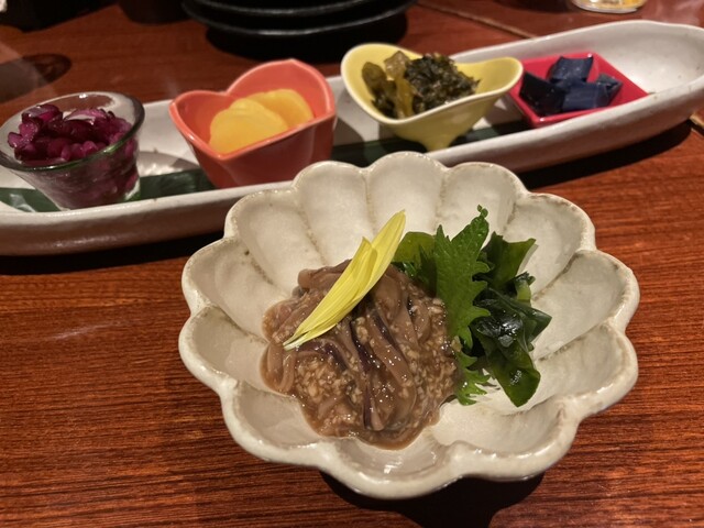 お通しはフグ皮のポン酢。ちょっと生臭いけど、まぁ、許...