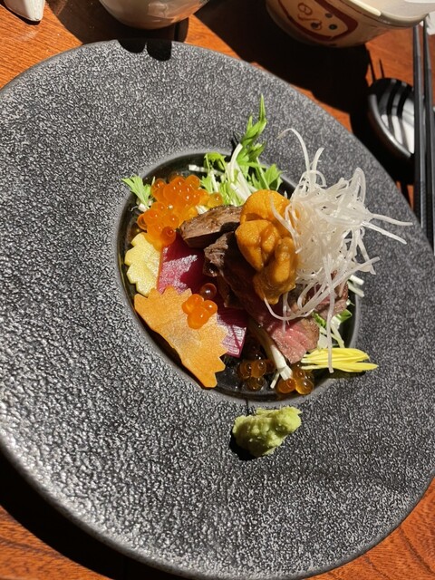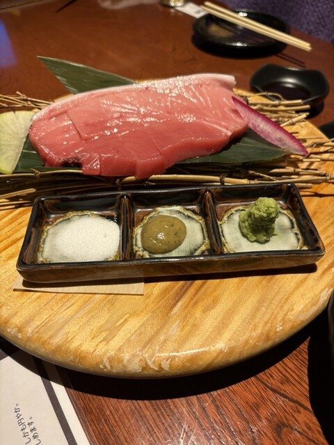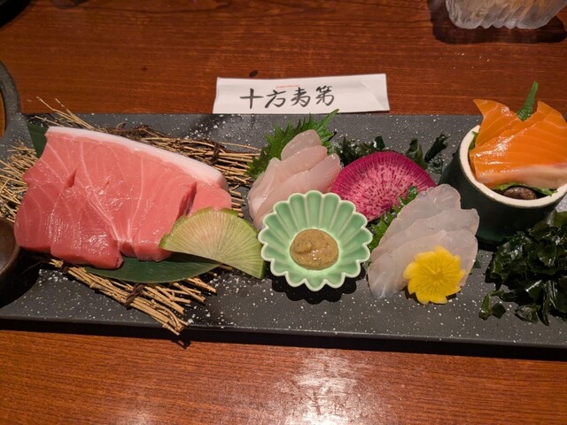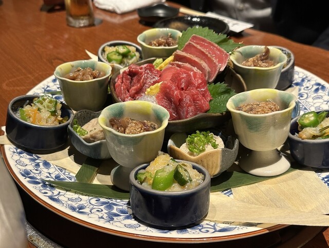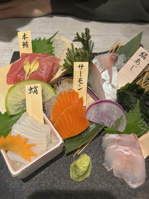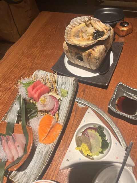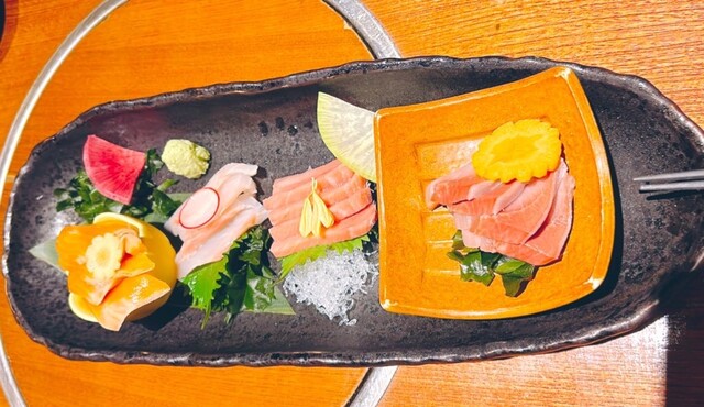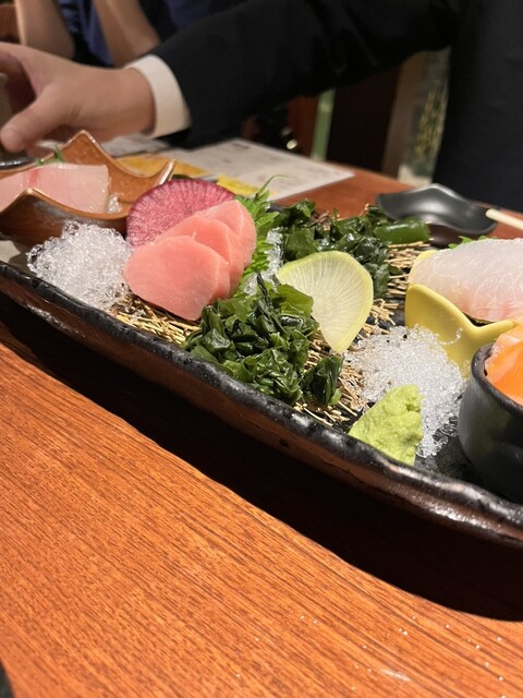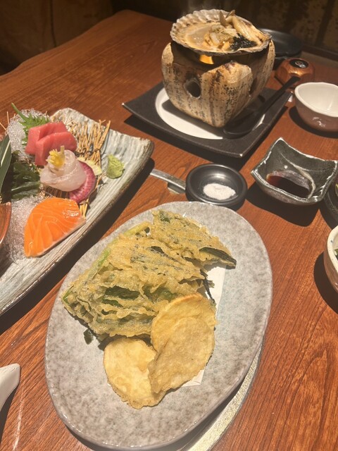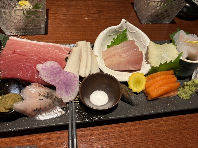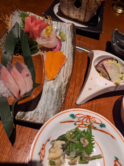 最初に刺身盛り合わせが届きましたが、豪華な感じの見た目で味も良し。その後は肉や天ぷら...