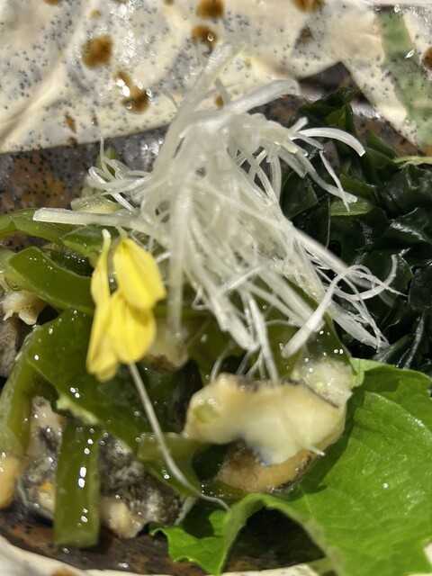 お通しはフグ皮のポン酢。ちょっと生臭いけど、まぁ、許...