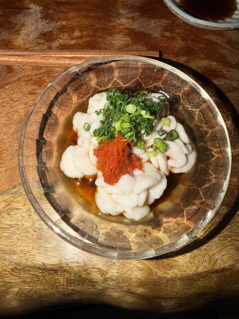 →新鮮でプリプリのほたてに、青唐辛子と塩味が加えられていました。イカの塩辛とは異なる辛味の付け方で、甘いホタテとこの辛味付け...