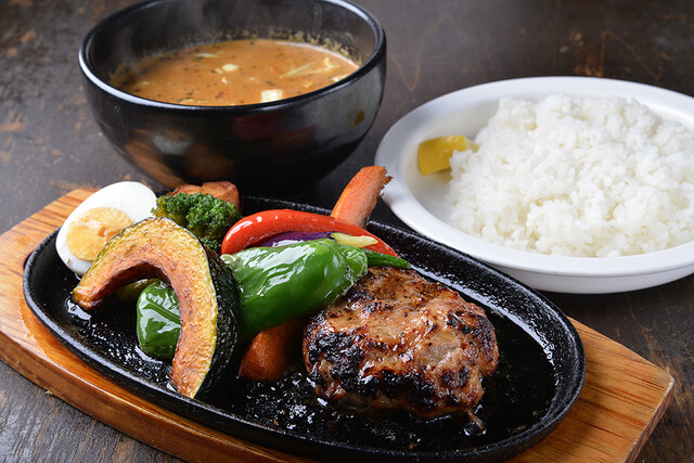 アツアツの鉄板にのったハンバーグと10年以上の伝統が受け継がれた人気のチリトマトスープの組み合わせは絶妙!飲んだ後の“〆スープカレー”としても人気の店です。