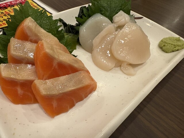 まずは生牡蠣とお刺身(サーモン・ホタテ)で乾杯。身が厚くてプリプリ!