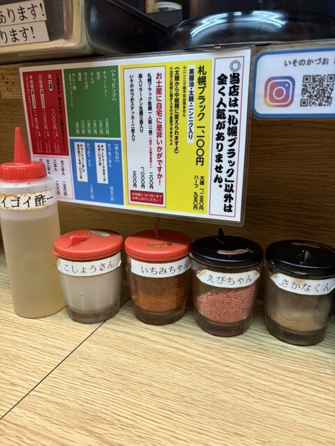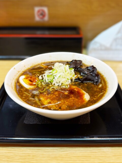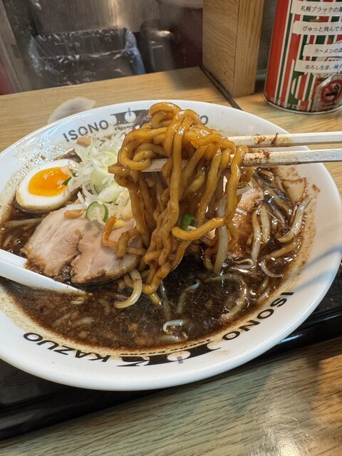 「いそのかづお」で札幌ブラックラーメンをいただきました。深夜の空気に、この漆黒スープは反則。着丼した瞬間、立ち上る醤油と香味油の香りでもう勝ち。