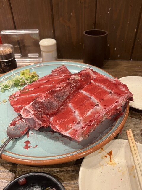 まぐろ希少骨付き中落ち(半):550円、「四文屋」は全国チェーンですが、多分、店舗によって提供されるものが違うと思っています。札幌、狸小路店では「まぐろ希少骨付き中落ち」がお勧めです。いつもあるとは限りません。半身ですが、びっくりする位の量があり、し...