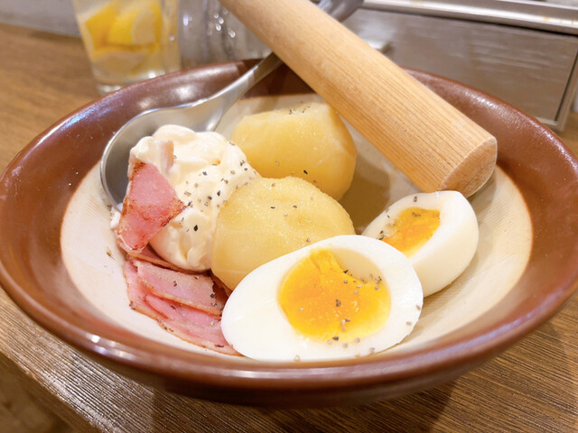 すり鉢に、茹でたジャガイモ、ゆで卵、ベーコン、マヨネーズ!!