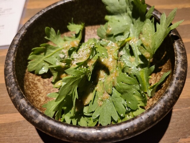 春菊に自家製のごまベースのソースかけたの。