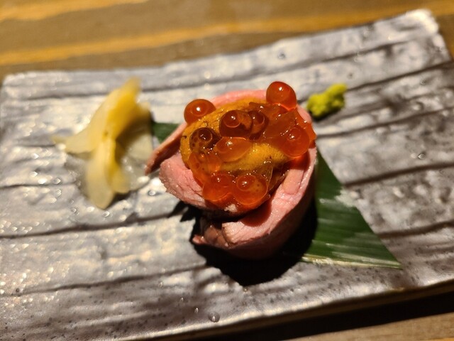 赤身のローストに雲丹とイクラが乗ってます。