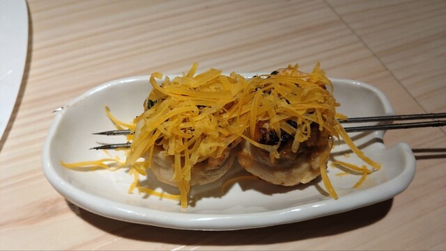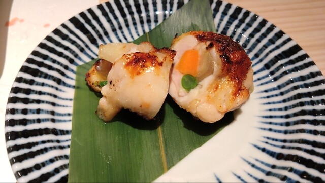 お通しに刺身、貝、雲丹の乗った冷やし茶碗蒸しをいただき、焼き鳥が焼けるのを待つ。