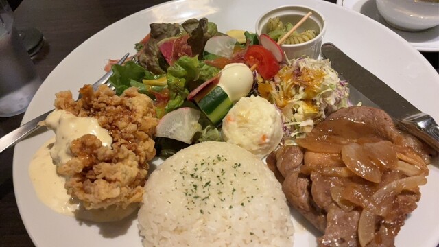 ランチのメインはジンジャーポークとチキン南蛮のセット。これまた肉が固い笑