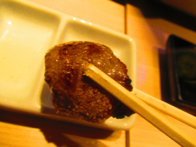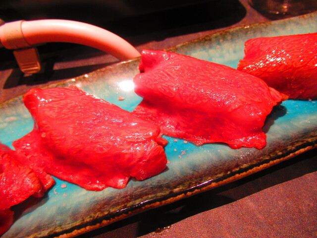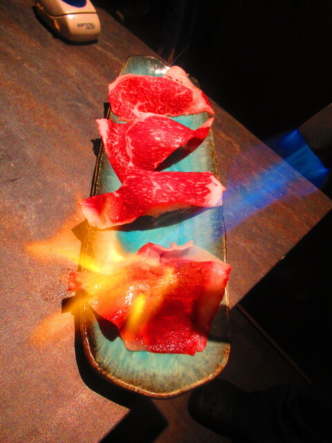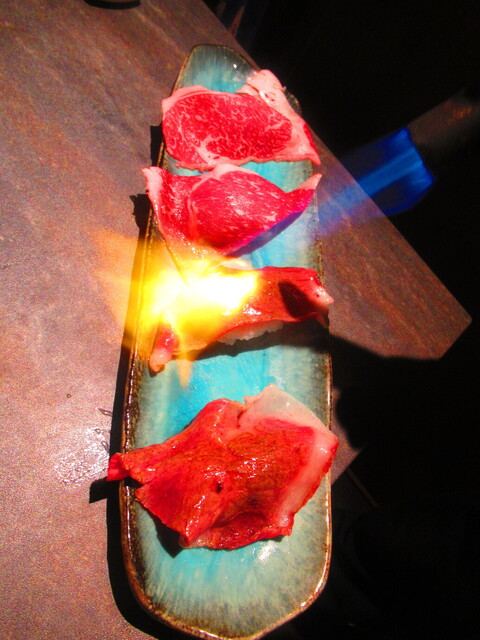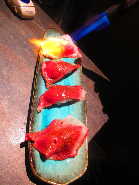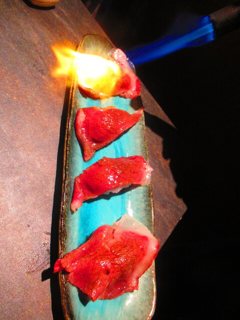 道産和牛ブリスケの炙り肉寿司4貫 2299円(税込)をバーナーで炙った後のアップ 1【2025年1月】