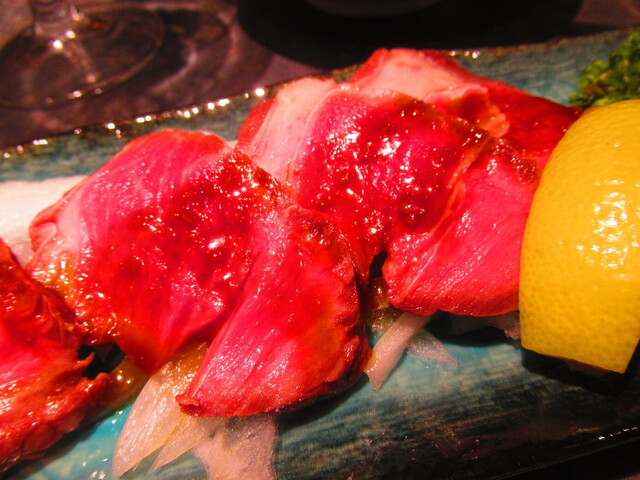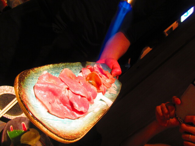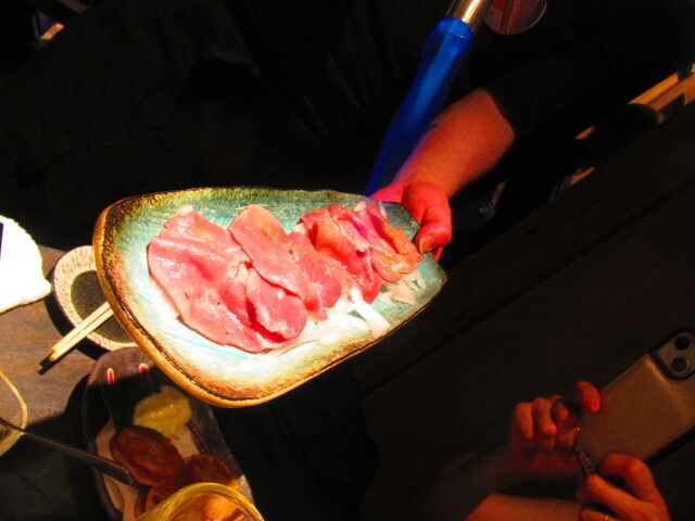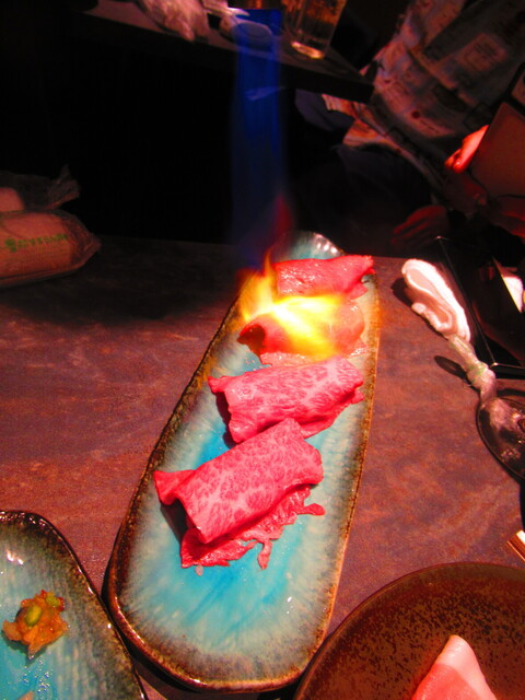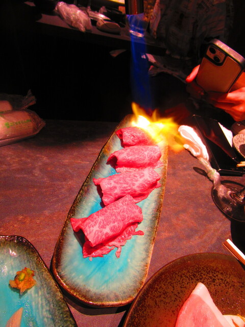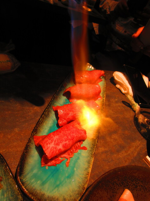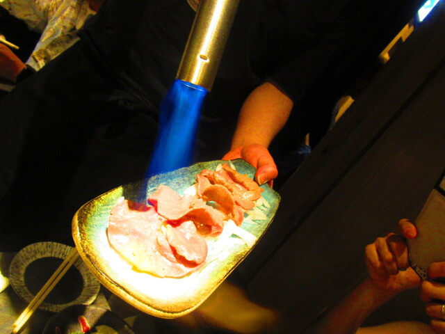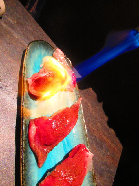 スタッフさんが、私達の目の前でバーナーで炙るスタイルの料理。