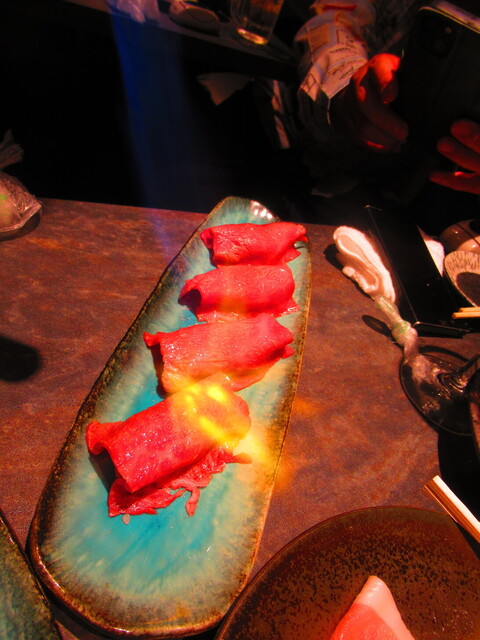 道産和牛ブリスケの炙り肉寿司4貫 2299円(税込)をバーナーで炙った後のアップ 2【2025年1月】