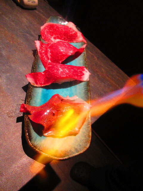 道産和牛ブリスケの炙り肉寿司4貫 2299円(税込)をバーナーで炙り中 5【2025年1月】
