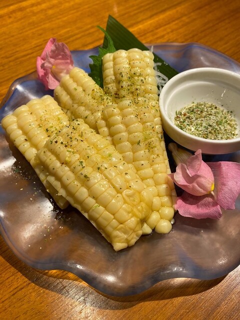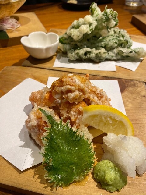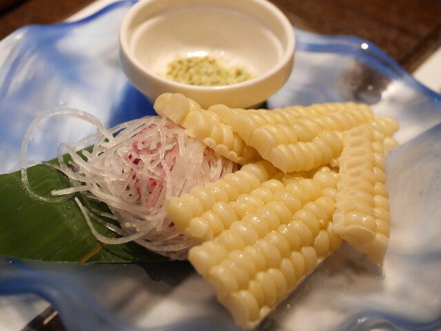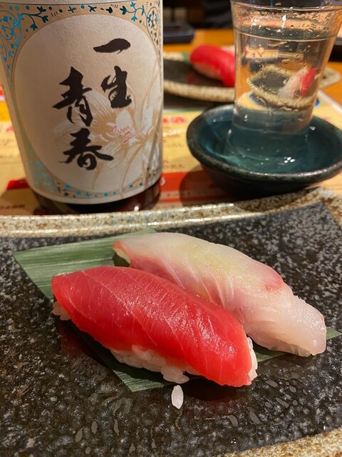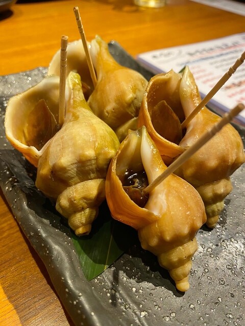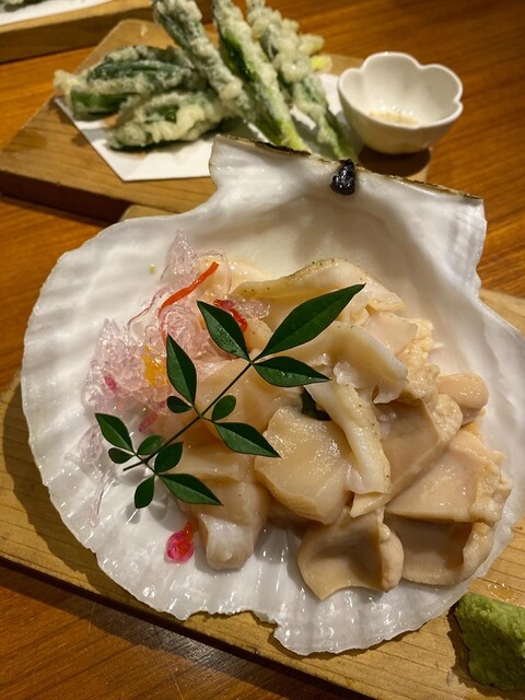 ◼️地酒と道産食材 一笑 本店 お通し 紅白鮨 450円 飲み放題 2,200円 天然大ホタテ刺身 1,850円 白とうもろこしの刺身800円 青つぶ煮 4個... 詳細を見る