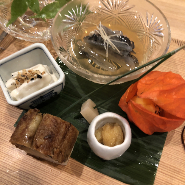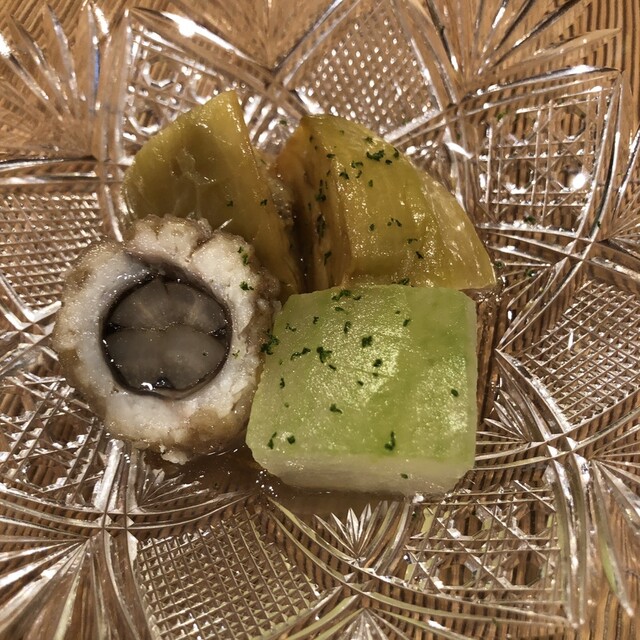 季節感たっぷりの冬瓜、鱧、加茂なす さっぱりと出汁の味がいい感じです。賀茂なすは、独特の歯触りや甘みがNICEですね。鱧も京都ぽくて統一感があります。
