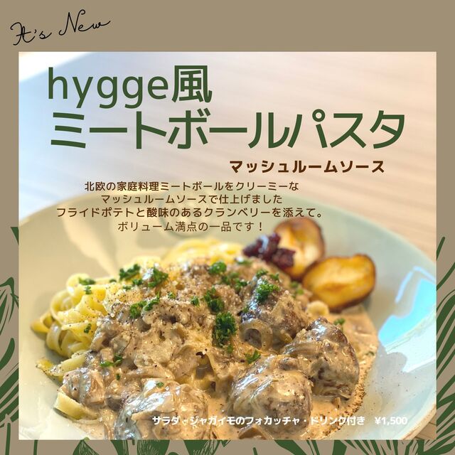 ふわふわのリコッタパンケーキ、体に優しい薬膳カリーや見た目が可愛いエスプーマクリームのスムージーやパフェなど、ご用意!「hygge」とは人と人のふれあいから生まれる、温かな居心地の良い雰囲気という意味の言葉。『美味しさ×健康×居心地』が全て揃う夢のような空間へ。