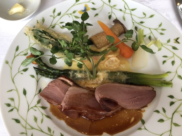 ホテルのレストラン。窓から緑が広がり高〜い天井の素敵なお部屋。お花模様の白い布のテーブルクロス。ひとつひとつの料理もこだわりを感じる。食器も綺麗で料理を引き立てている。焼きたてパンが食べ放題。どれも上...