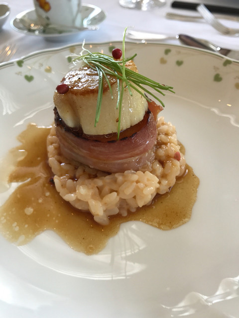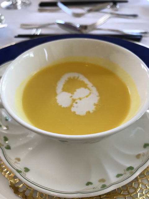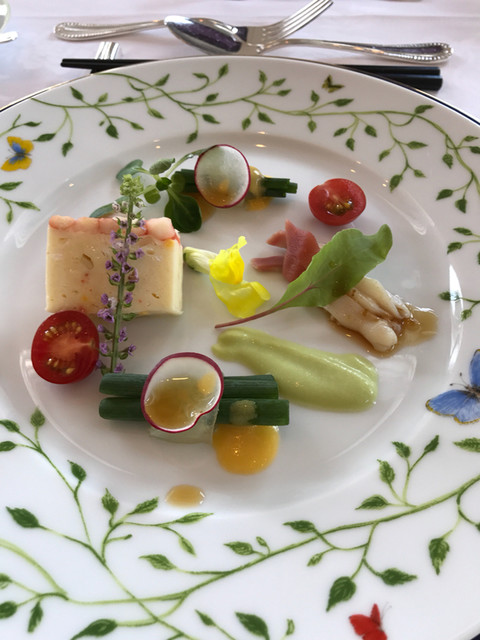 ホテルのレストラン。窓から緑が広がり高〜い天井の素敵なお部屋。お花模様の白い布のテーブルクロス。ひとつひとつの料理もこだわりを感じる。食器も綺麗で料理を引き立てている。焼きたてパンが食べ放題。どれも上品で美味しかったです。