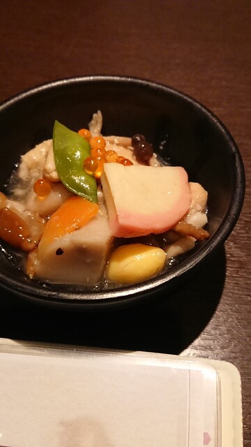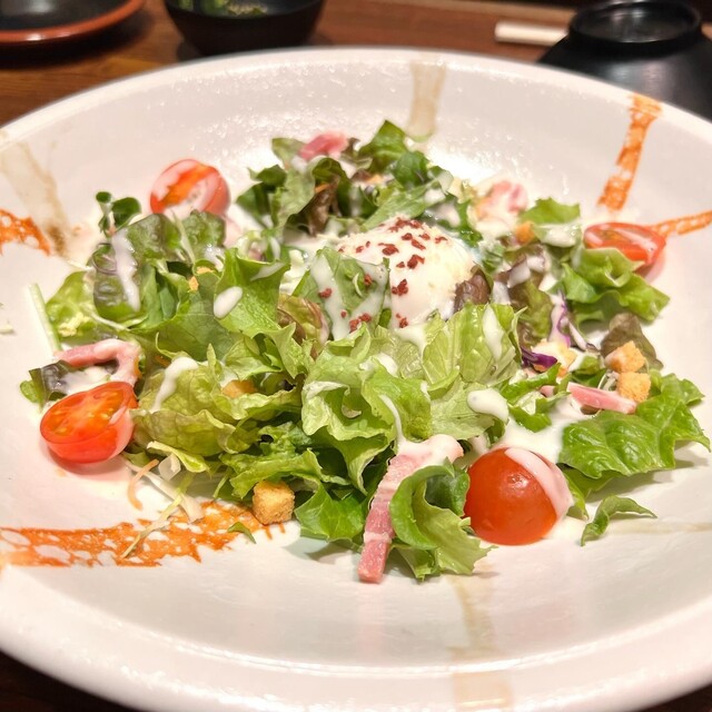 鍋をメインとしてサラダ、刺身、鴨、だし巻きが出て来ました。小鉢から始まり温玉とベーコンのシーザーサラダ、焙煎胡麻カンパチ、合鴨ねぎまみれ旨塩タレ、青海苔香る出汁巻きたまご、厳選鶏の白湯水炊き鍋からの〆のラーメン。