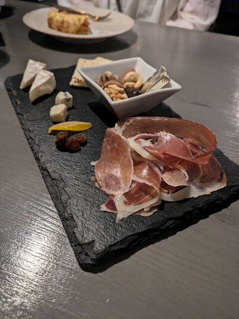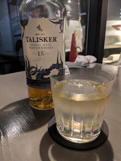 店内は移転前のお店と雰囲気似ている大人な造りで吹き抜け天井高くカウンター向こうの壁にはお酒類がいっぱい、足高カウンター席と低めテーブル席少々で構成されます。