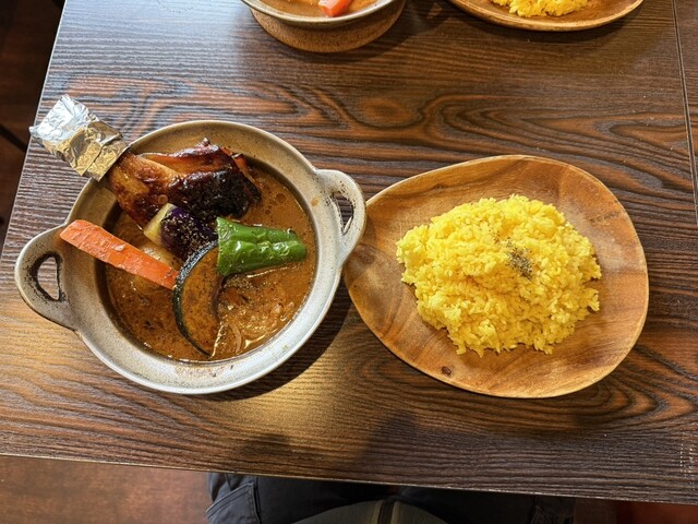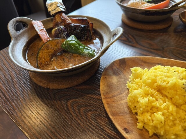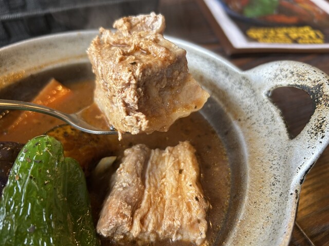 【豚角煮と野菜のカレー:1,300円】 今回は菊水店へ。 サラサラ系のスープ。しっかり炒めてある玉ねぎが投入、スープカレーの具材では中々採用されない気がしますがしっかり美味しいです。 スープの辛さは0~5番までが基本、4番のカラ辛をオーダー、そんなに辛さを感じませんでした。辛めが好... 詳細を見る