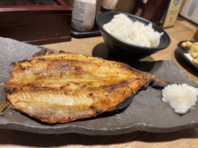 シマホッケは、スーパーで買って家でも食べられるが、家の魚焼き器はしょぼくて美味しく焼けない。居酒屋のホッケはいい感じに焼けていて美味しいですね。特別に良いホッケでは無いはずだけど、焼き方の上手さで、ポテンシャルを上手く引き出していると感じました。ご飯の大と共に、実質、ホッケ定食にしました。