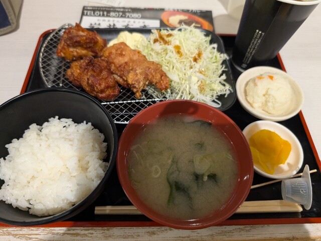 ミニでもザンギが3つ、ご飯も選べる、お味噌汁たっぷり。キャベツもポテサラもあるし、セットのドリンクは77円だし、量は十分でした。