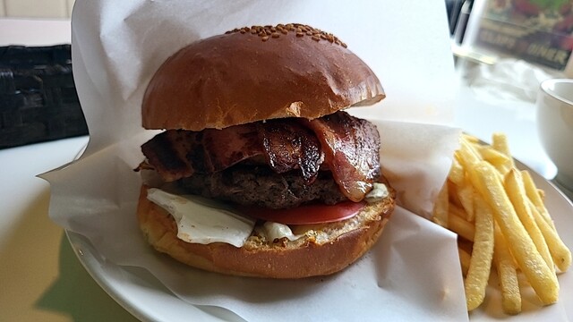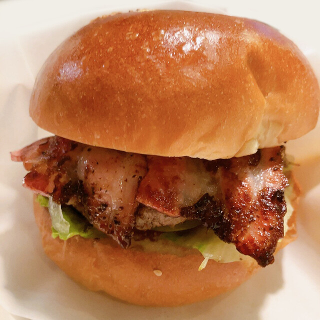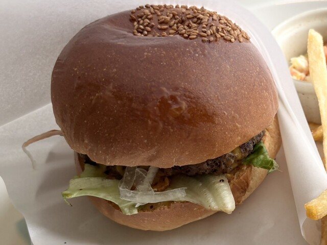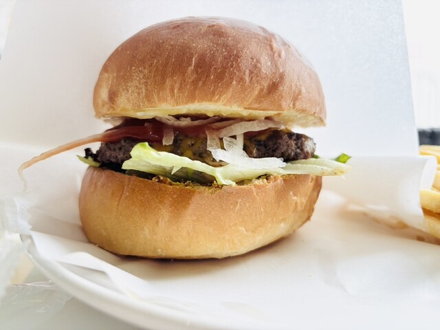 市内のパン屋さんにオリジナルオーダーしたブラウンバンズ。パテやトッピング、ソースにぴったりの相性です。そしてビーフ100%のパテにはジューシーさとコクをだすのに和牛脂を合わせているのがポイントです。コシのある本場アメリカンなボリュームたっぷりのハンバーガーをお楽しみいただけます。もちろんランチタイムのテイクアウトもOKです!お気軽にお立ち寄りください。