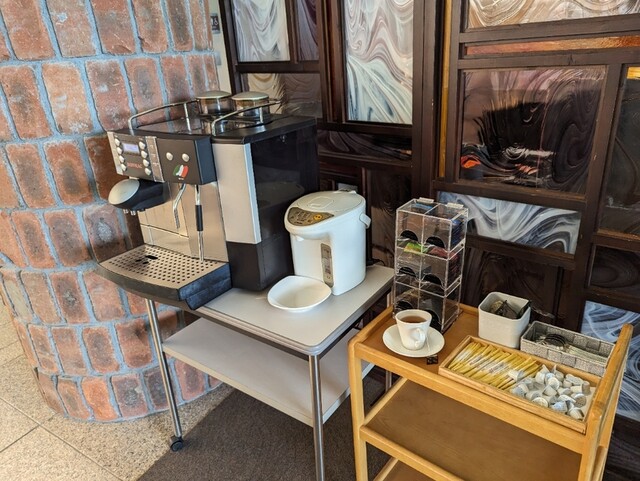 レストランに入る手前のラウンジに、喫煙できるソファあり。 |