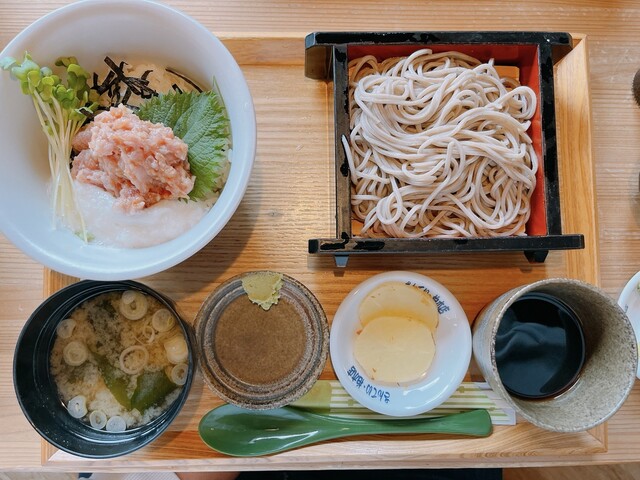 お客様から預かるもう一つの食卓をコンセプトに。道南杉溢れるカフェ気分の店内 コーヒー&オリジナルデザートでゆっくりとした時間 地域の食材をオリジナリティ溢れるお蕎麦に 日本酒・そば前を楽しめる お子様メニューもございます