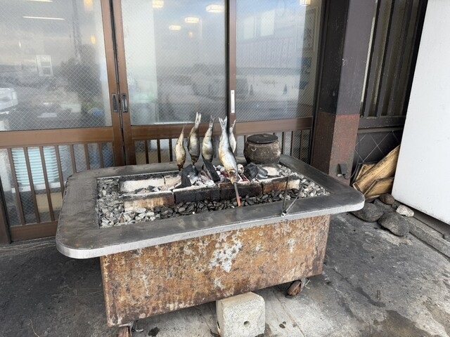 店先でにしんを串で焼いていて、店内では貝を焼いてます。