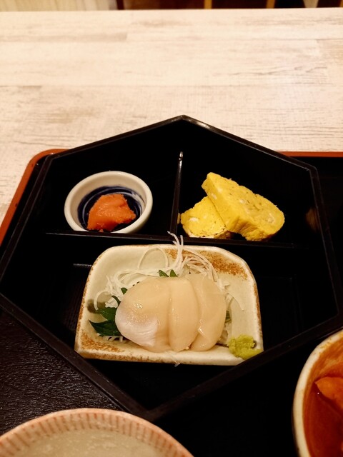 まずは「前菜」がツブ貝煮と変り豆腐の2品、「刺...