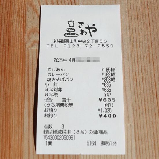 ◇ 635円(こしあんパン 185円 / カレーパン 192円 / 焼きそばパン 258円)