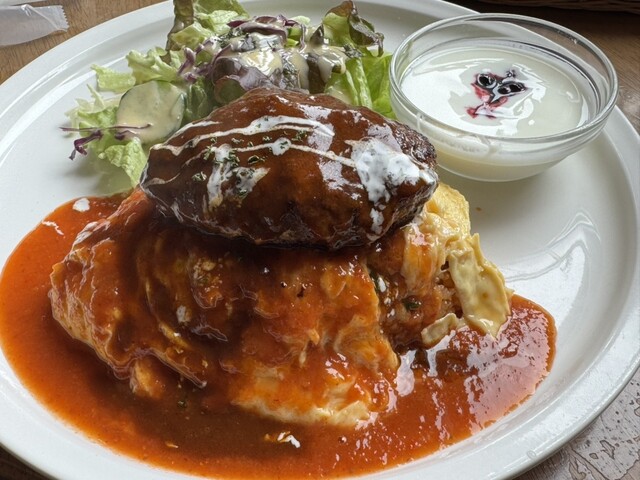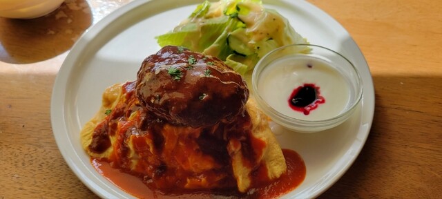 新冠のサラブレッドを見たらもうすぐお昼時。海鮮は少し飽きたしなぁ、と思っていると妻から「オムライスは?」という提案。それは有りでしょうと即答しやって来ました。国道沿いに焼肉屋さんと並んでいます。薄いブルーの板張り風の外装に鹿の角、見るからにアメリカンな食堂です。10月の平日の11時半、店内はほぼ満席と地元の人気店のようです。メニューを見ながら私も妻もオムライスにハンバーグをプラスしたものをオーダー...