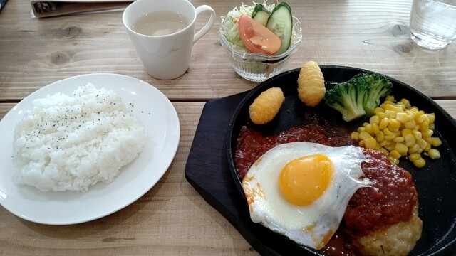 祝日のランチタイム。先客無し後客無し。本日は月曜日なのでメンズDayとのことでランチメニュー全て150円引き。ハンバーグセットは1200円が1050円でした。