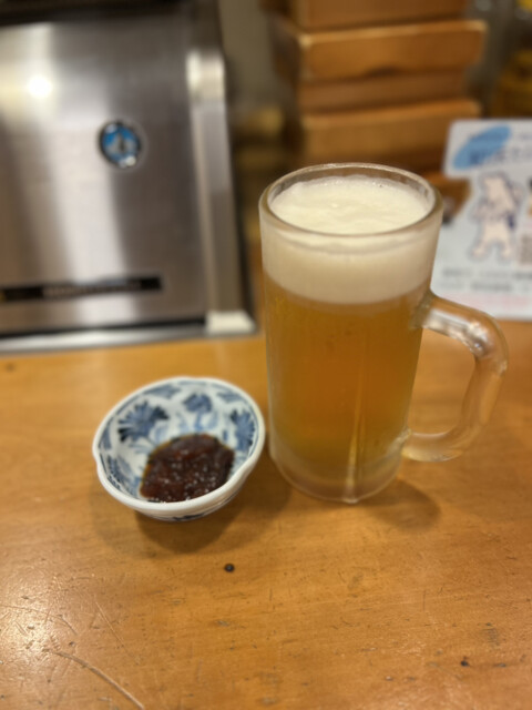 まずビール。お通しはつぶ貝と三つ葉の和物。これ美味しいです。
