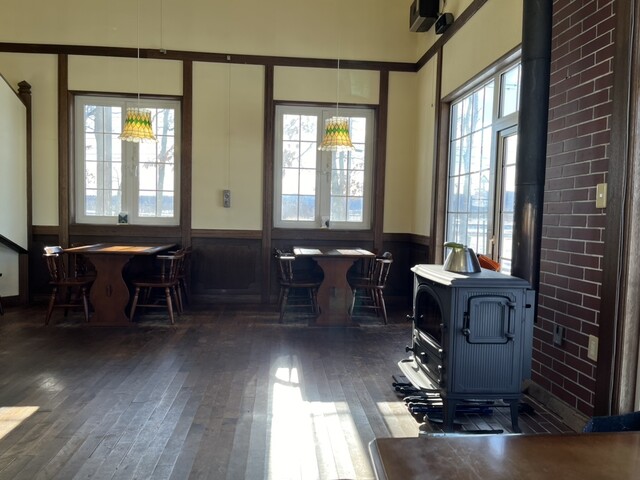 雪が多い時期だったので、暖炉のある暖かい店の中からの雪の景色をのんびり楽しませていただきました。
