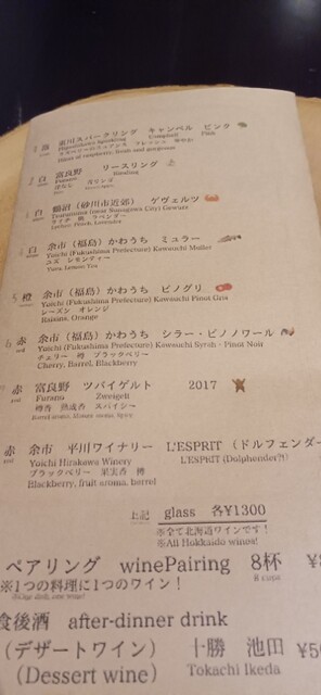 ワインのペアリングを頼むと富良野ワイン他素晴らしい...