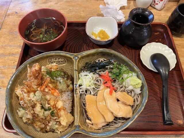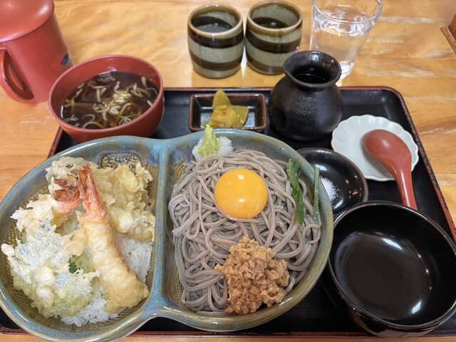 本日のランチはこちら。新そばということで店内は混んでいましたが、離れの2階に案内されかえってゆっくり食べることができました。いつものようにアベック丼を選択。今回は冷やかしと天丼のセットにしました。