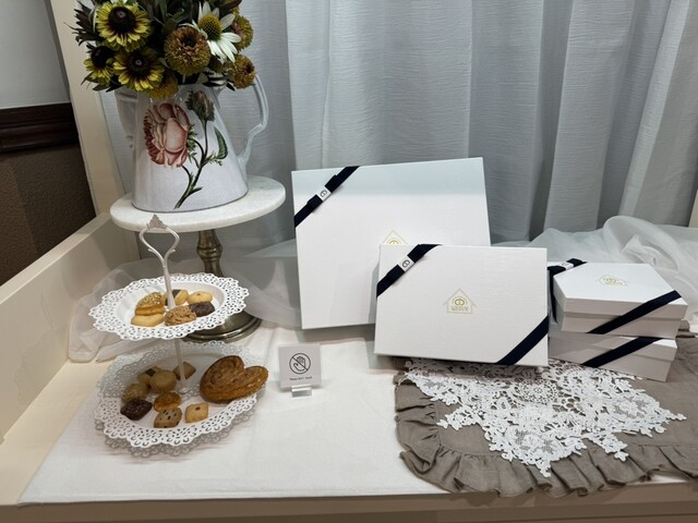 コクのあるバターをたっぷり使用したハート型のサクサクパイと手作りのミックスクッキーの詰め合わせが入った可愛らしいお家型の箱(^。^)
