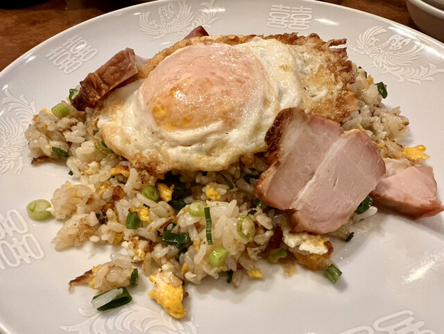 分厚くざく切りの焼き豚が刻んで入っているのではなく、焼き飯に乗っかってる。
