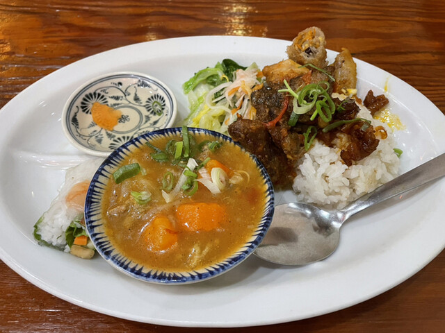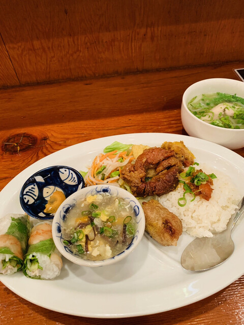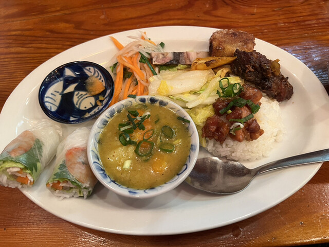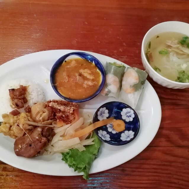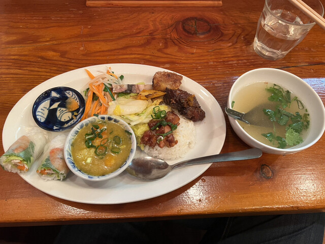店主がハノイの食堂経験をベースに優しくも味にボヤケがない正統北ベトナム料理を提供。日本では手に入らない香草や香料を年に何度も仕入れ、惜しげもなく使うという。昨年プチ移転しテーブル席も新設、多彩な一品バリエで夜も盤石。神戸らしく本格エスニックのきっちり旨い女子ひとり飯にも対応のスゴ技。定番人気の生春巻き600円や揚げ豆腐のココナツ風味などアラカルトメニューも充実。おすすめはフォーに一品が付くセットで...ハノイの鶏肉フォーセット700円。牛肉を細かく砕きニンニクを混ぜたミンチのフォーボーでも可。麺にご飯が付いたセットや定食はお代わり自由で、メンズも満足する内容はさすがとも言うべき。