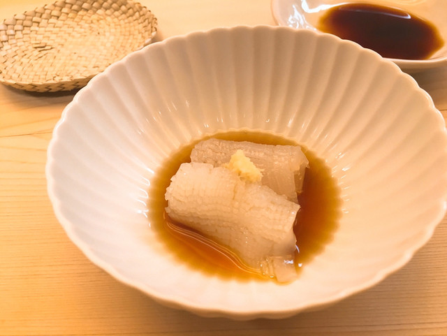 数寄屋造りの名工が手掛けた簡潔な店内は、街中から突然別の空間に来た様な印象を受けるでしょう。 店主自慢の檜の一枚板のカウンターは木曽の檜を使用しており、席に掛けて頂くと優しい質感と色調にゆったりとした落ち着きと美味への予感を感じて頂けるかと思います。