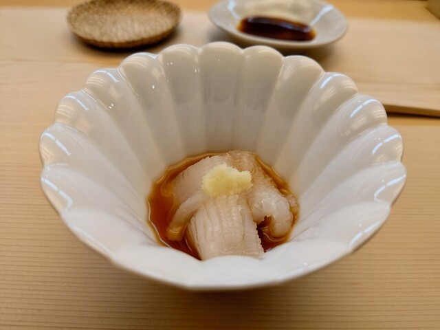 数寄屋造りの名工が手掛けた簡潔な店内は、街中から突然別の空間に来た様な印象を受けるでしょう。 店主自慢の檜の一枚板のカウンターは木曽の檜を使用しており、席に掛けて頂くと優しい質感と色調にゆったりとした落ち着きと美味への予感を感じて頂けるかと思います。 |