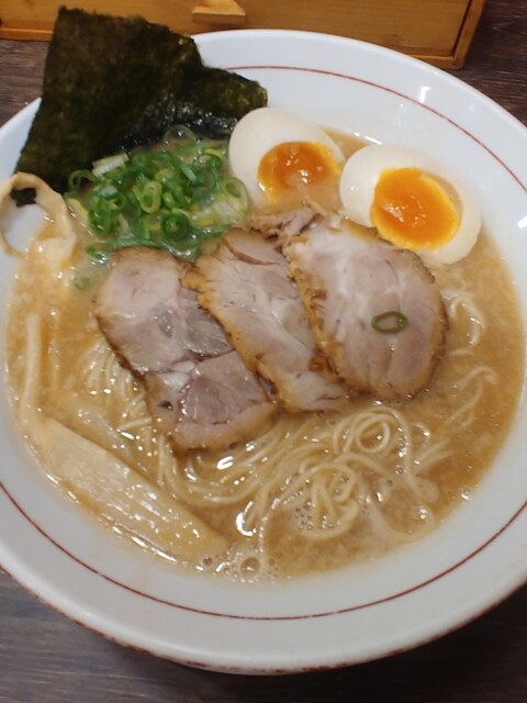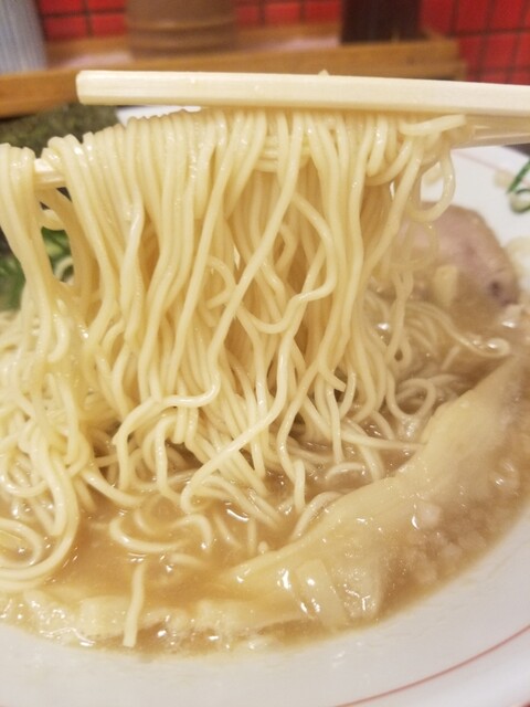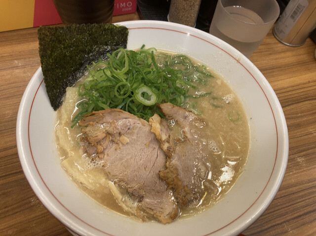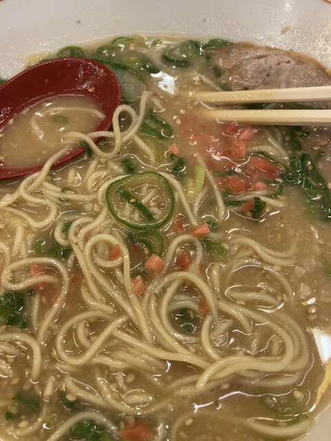 寝る前の〆にと、連れに連れて来て貰いました。 地元の代表店の一つとのことです。 入口の券売機でラーメン ネギ増しで食券を買い席に着きます、特に固さは聞かれないのでお任せでした。... 詳細を見る